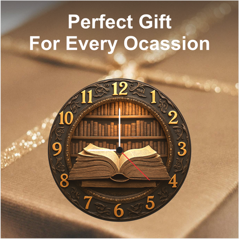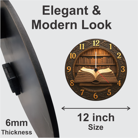 TERA MERA GIFT 3D Wooden Book Theme Wall Clock 12 Inch Round Clock – Vintage Library Decor for Study and Office
