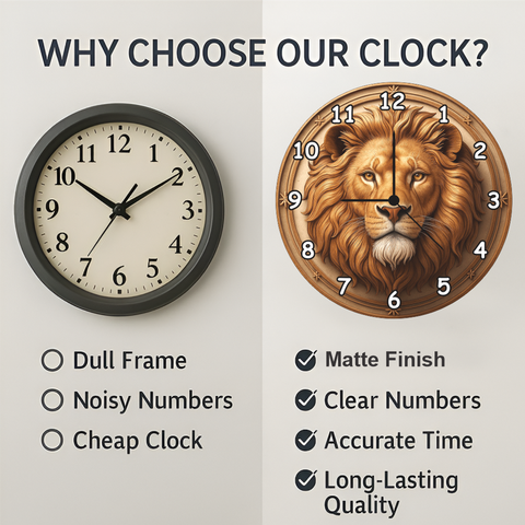 TERA MERA GIFT 3D Wooden Lion Wall Clock blends strength and sophistication. With realistic lion embossing and smooth silent quartz technology, this 12-inch wall clock adds royalty to your walls. It’s ideal for modern homes, wildlife-inspired spaces, or elegant office setups.