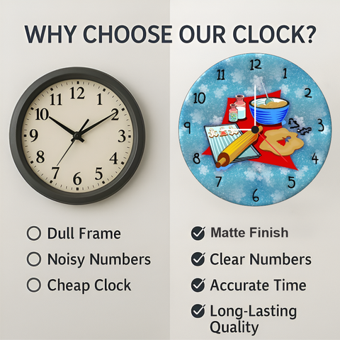 TERA MERA GIFT introduces the Baking Essentials Wall Clock, a perfect 12-inch matte finish decor piece for every baker’s kitchen. Made from durable MDF and equipped with a reliable quartz movement, it’s both functional and stylish.