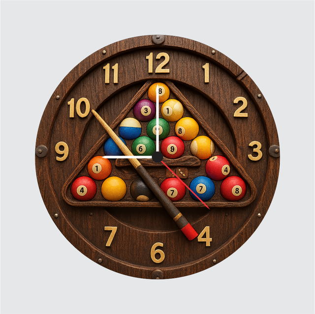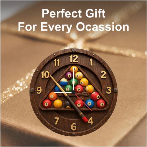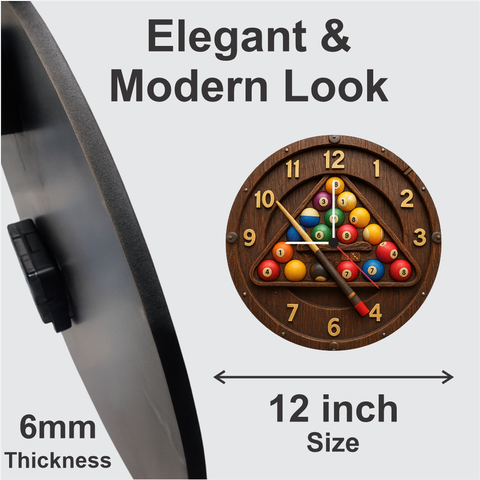 A premium billiards‑themed wall clock designed for sports lovers and game room décor. Featuring realistic pool balls, wooden texture, and bold golden numbers, it adds a fun yet classy touch to bedrooms, living rooms, bars, and entertainment spaces. Lightweight, durable, and quartz accurate, it also makes a perfect birthday or festive gift.