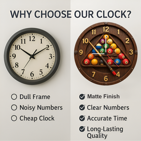 - Accurate quartz movement → Smooth ticking → Reliable for game rooms, bars & entertainment areas