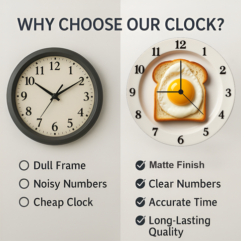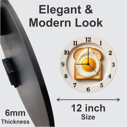Bring joy to your kitchen or dining space with this unique egg-and-toast wall clock. The realistic design paired with bold numbers and a silent quartz mechanism makes it both decorative and useful. Perfect for homes cafés breakfast bars or gifting for food lovers.