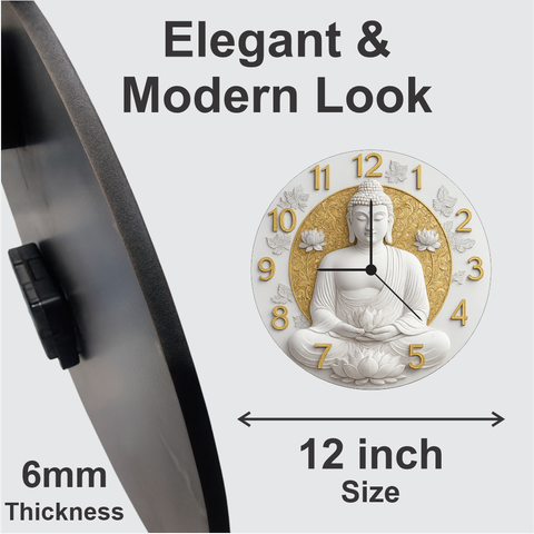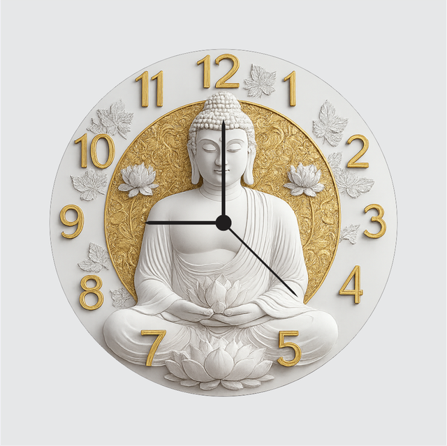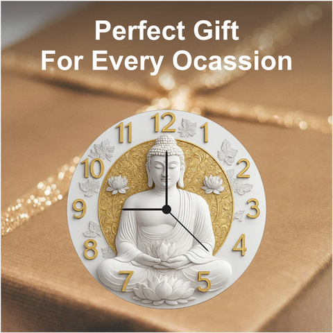 A serene Budhha-themed wall clock designed to create a peaceful atmosphere in any home or workplace. The white and gold artwork radiates calmness, while clear golden numbers ensure easy readability. Lightweight, durable, and powered by precise quartz movement, it is a perfect choice for meditation rooms, living areas, offices, or as a meaningful spiritual gift.