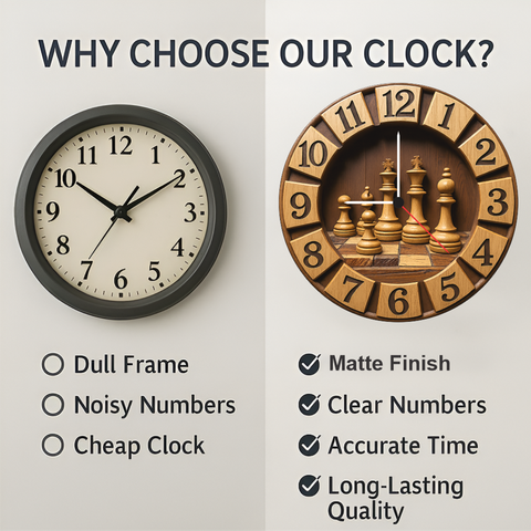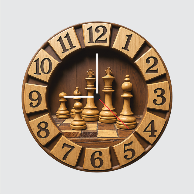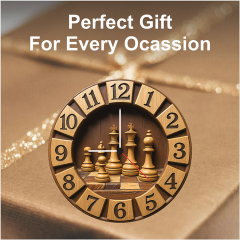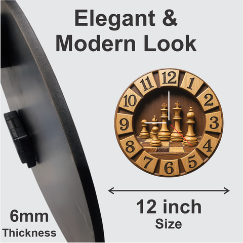 A premium chess-themed wall clock crafted with wooden texture and detailed chess pieces. Its classic design enhances offices, study rooms, gaming setups, and living spaces. Lightweight, durable, and powered by accurate quartz movement, it makes an impressive gift for chess lovers, gamers, and professionals.