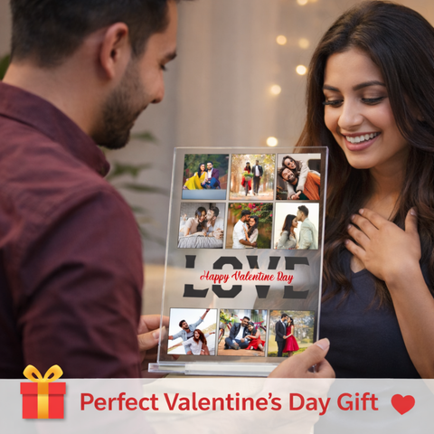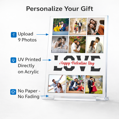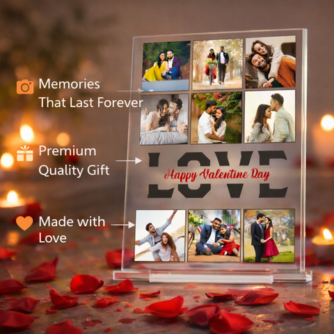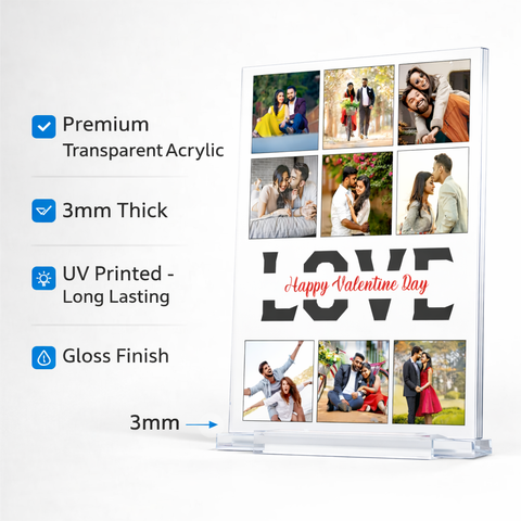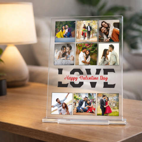Crystal clear acrylic collage frame printed using UV technology, customized with multiple couple images and love theme design to preserve memories beautifully.