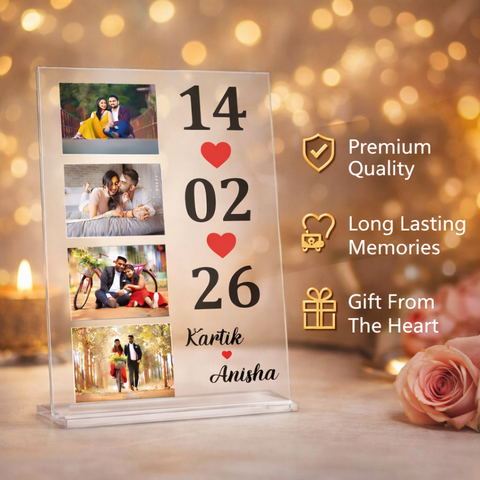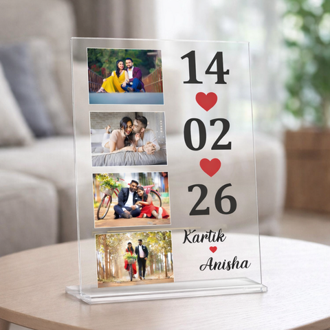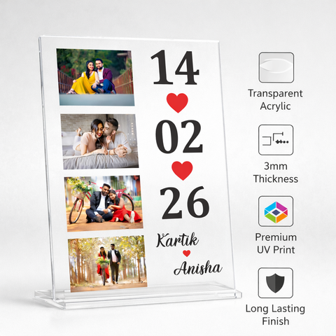Crystal clear acrylic collage photo frame printed using UV technology, customized with multiple couple images names and date to preserve love memories beautifully.