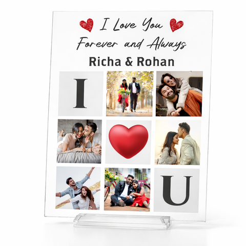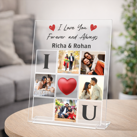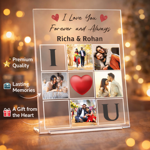 Crystal clear acrylic collage frame printed using UV technology, customized with couple images names heart design and love message for lasting romantic memories.