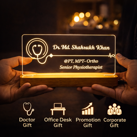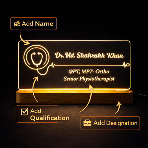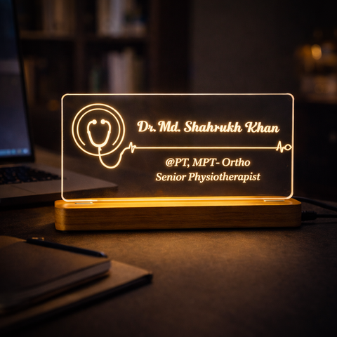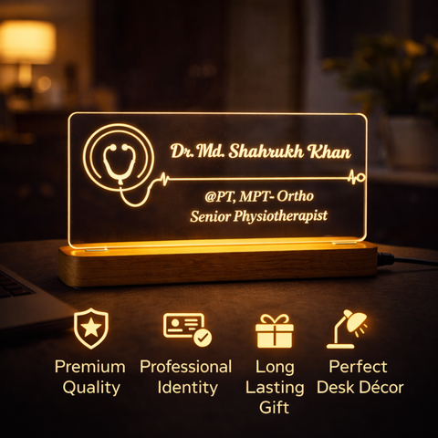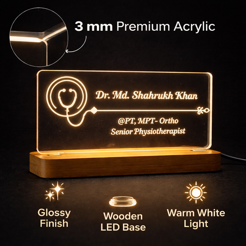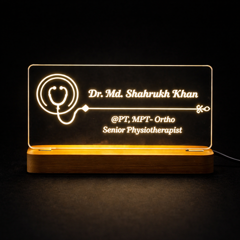 Premium 3mm acrylic LED name plate with glossy finish and wooden base. UV printed name and designation make it ideal for doctor clinic desk office decor gifting.