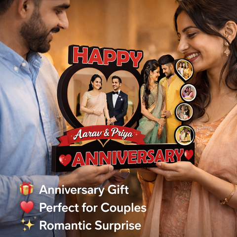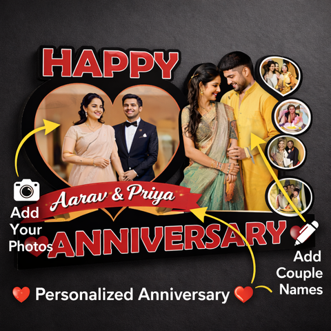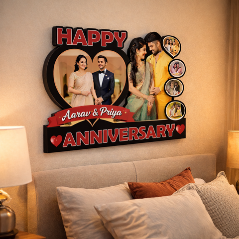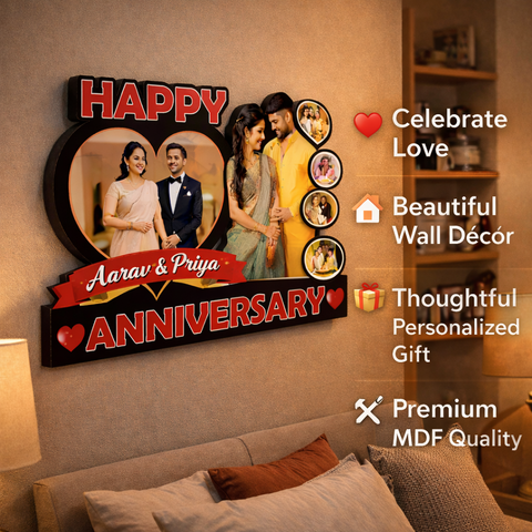 Premium MDF anniversary wall frame with matte vinyl print, customized with couple photos and names. A meaningful decor gift to celebrate wedding anniversaries.