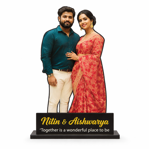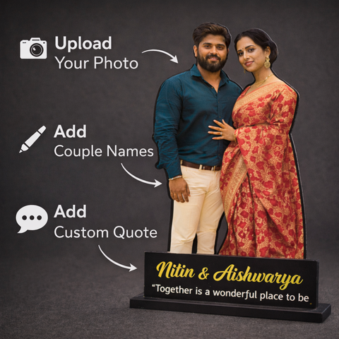 Premium MDF personalized couple photo stand with matte vinyl print, customized with photo and names. A stylish keepsake for couples to display love and memories.