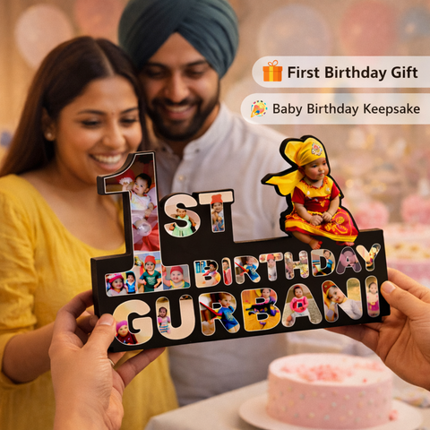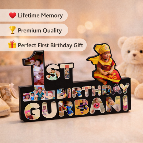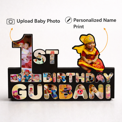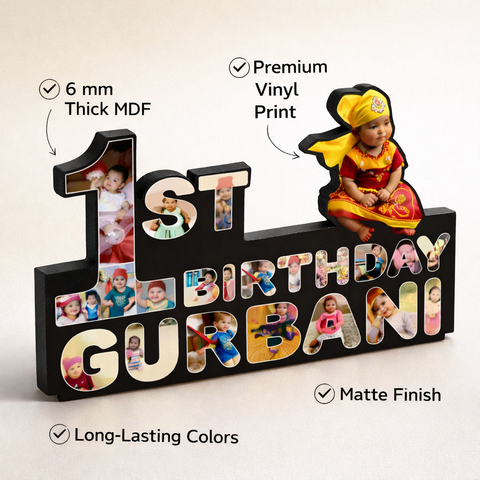 Premium MDF first birthday wall frame with matte vinyl print, customized with baby photos and name. A special keepsake to celebrate a child’s first birthday.