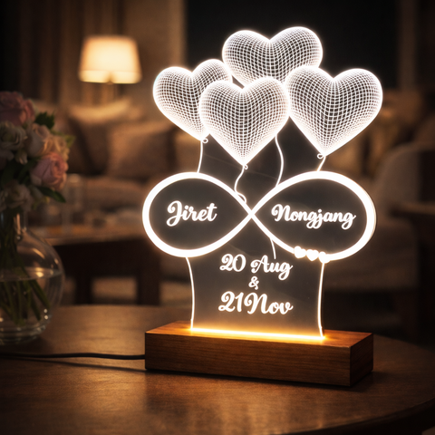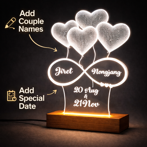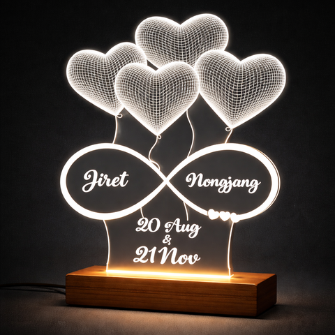 Premium 3mm acrylic LED couple lamp with heart design and glossy finish. Customized names and date with wooden LED base make it ideal for romantic gifting.