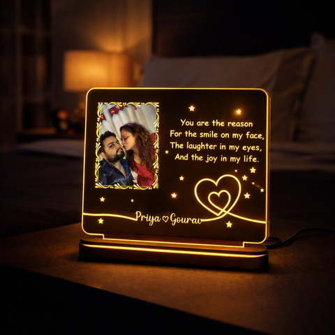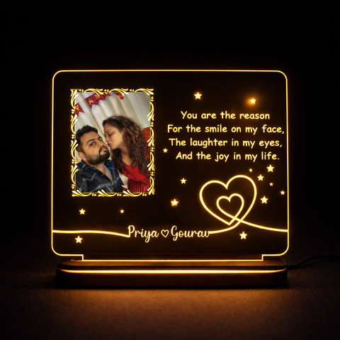 Personalized acrylic photo lamp with premium wooden LED base and UV printed photo. Creates a warm romantic glow, perfect for bedroom decor, gifting loved ones and capturing special memories.