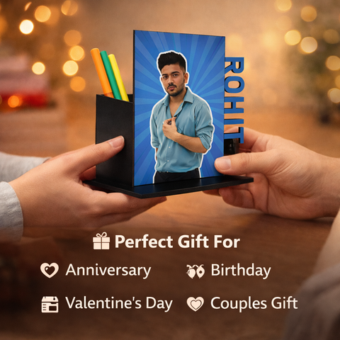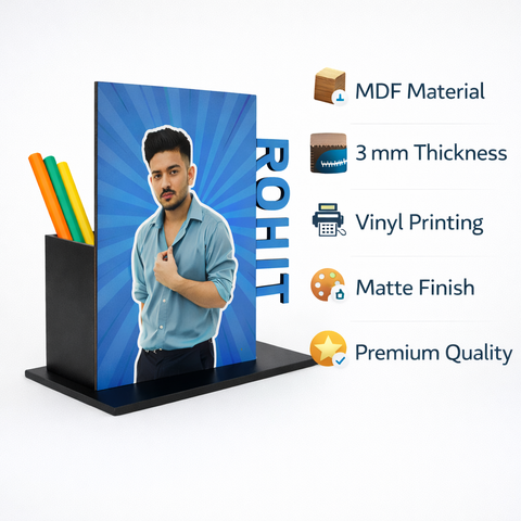 Premium matte finish MDF photo pen holder customized with your photo and name. Strong 3 mm MDF build makes it a perfect desk decor gift for birthdays anniversaries and Valentine occasions.