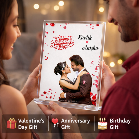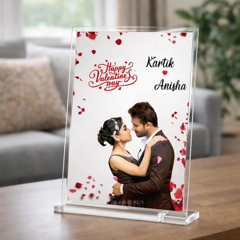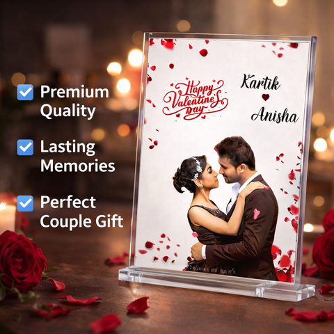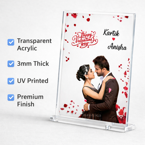 Crystal clear acrylic Valentine photo frame printed using UV technology. Customized with couple image names and heart theme to create a memorable romantic keepsake gift.