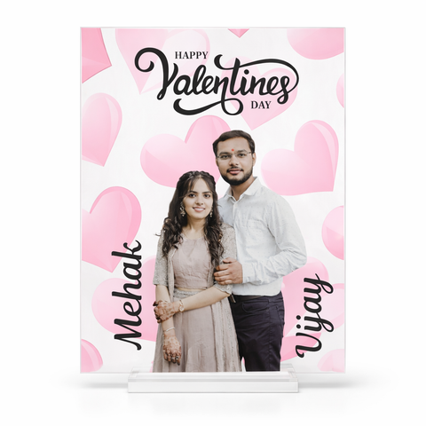 Crystal clear acrylic Valentine couple frame printed using UV technology, customized with couple image names and heart theme to preserve love memories elegantly.