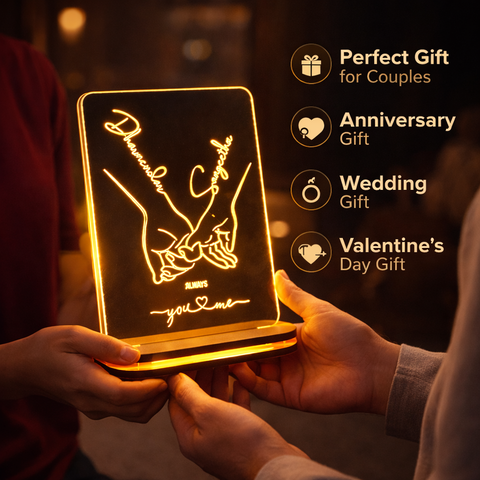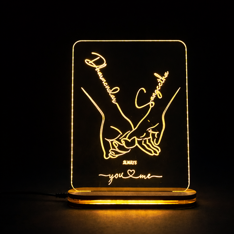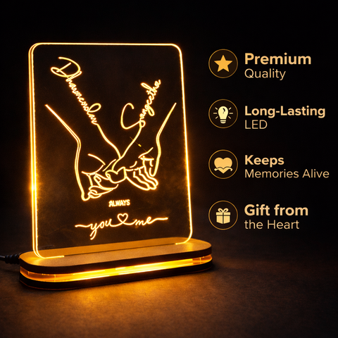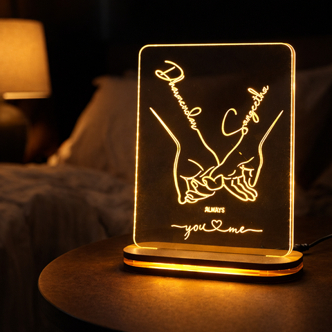 Premium personalized LED acrylic lamp with elegant couple hand line art and custom names. Warm glowing light with wooden base adds romance to bedroom living room and gifting moments
