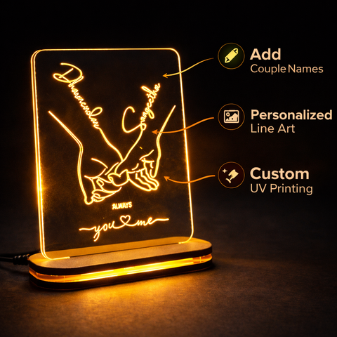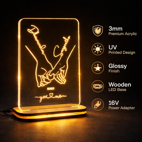 - Personalized romantic LED lamp crafted from premium transparent acrylic with elegant couple hand artwork and custom names printed using high quality UV technology for lasting clarity