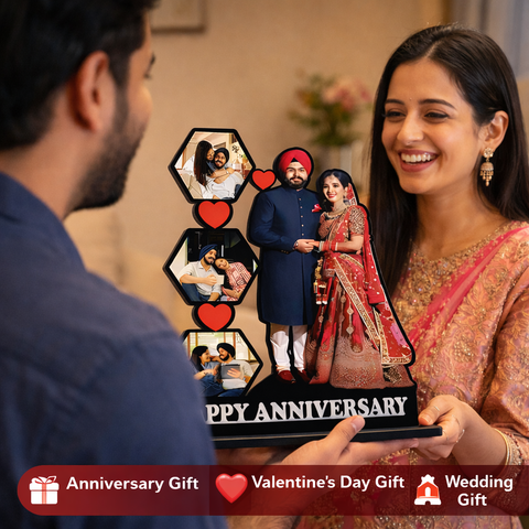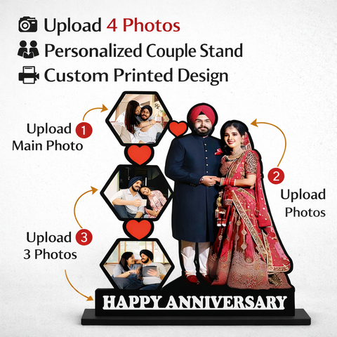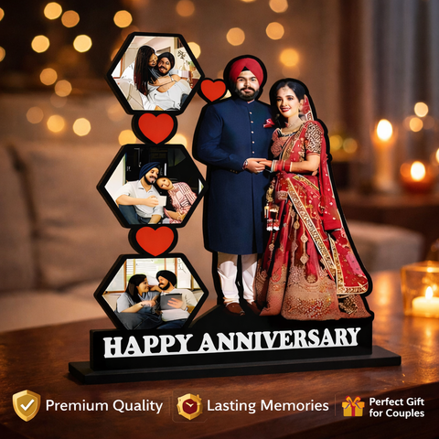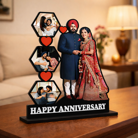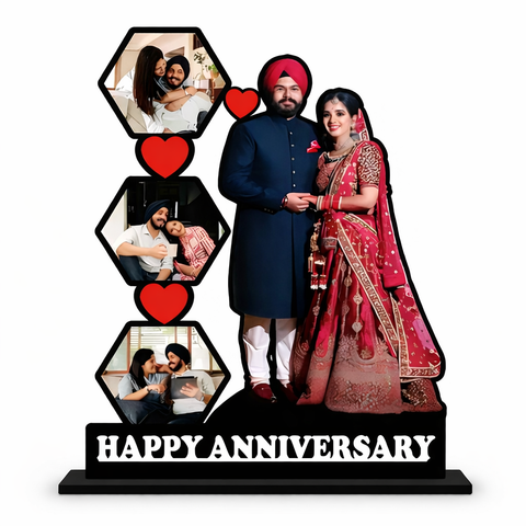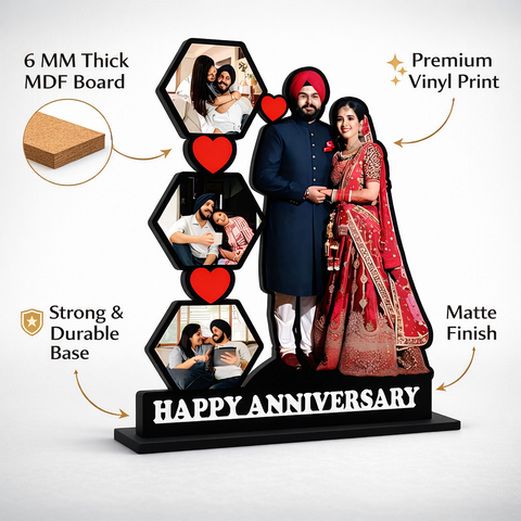 Personalized MDF anniversary photo stand featuring couple name and multiple photos printed using vinyl print. Premium matte finish creates elegant decor and lasting memories