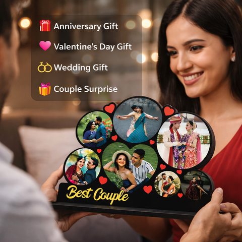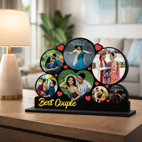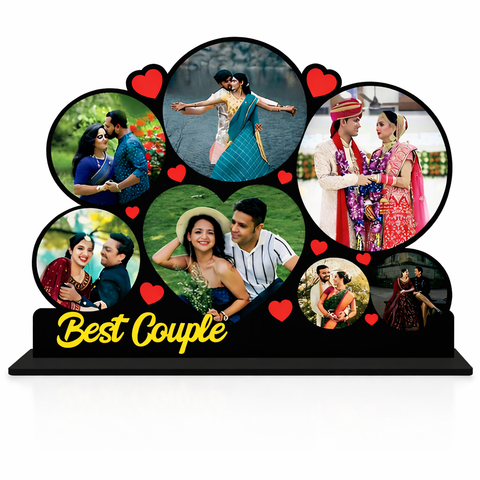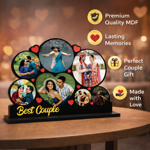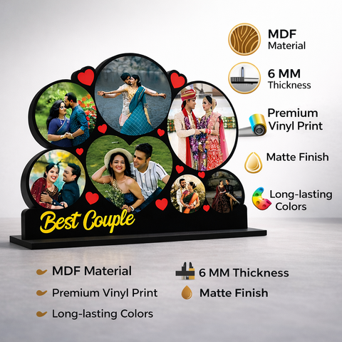 Personalized MDF best couple photo stand featuring multiple couple photos and heart design printed using vinyl print. Premium matte finish makes it a romantic decor keepsake
