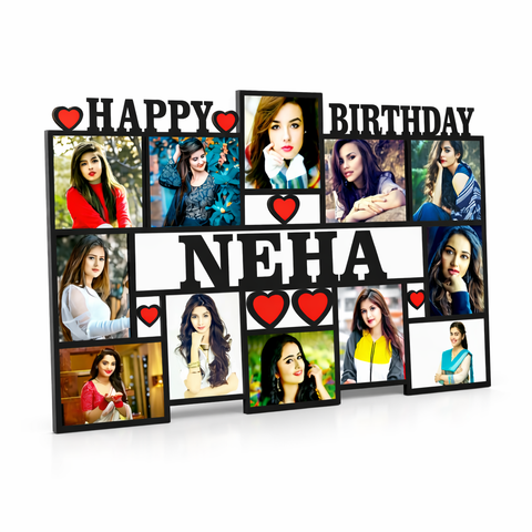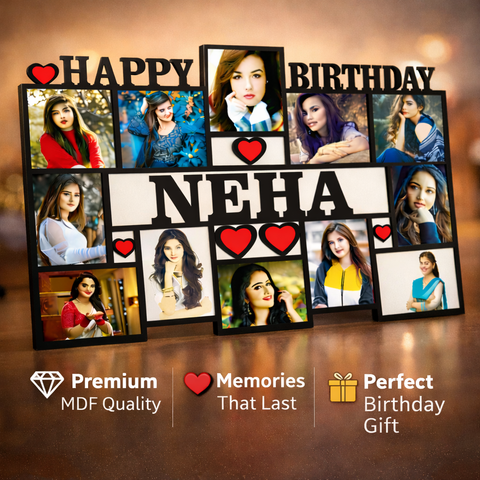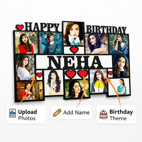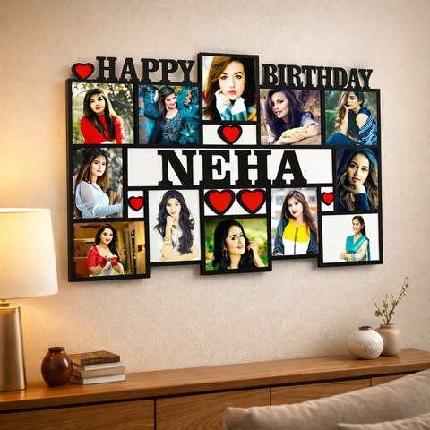 TERA MERA GIFT Customized Birthday MDF Photo Frame Wall Hanging with Name Happy Birthday Design Multiple Pictures Matte Finish Gift