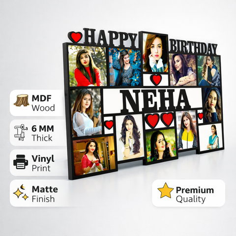 Personalized happy birthday MDF photo frame with name and multiple photos printed using vinyl print. Premium matte finish makes it a perfect wall decor and memorable birthday gift