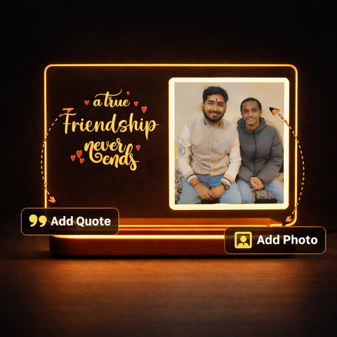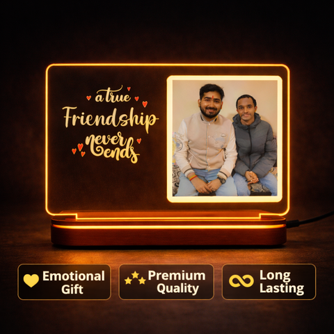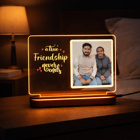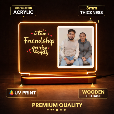 Premium transparent acrylic LED photo frame with wooden base. UV printed photo and quote create a warm glowing keepsake perfect for friendship memories.