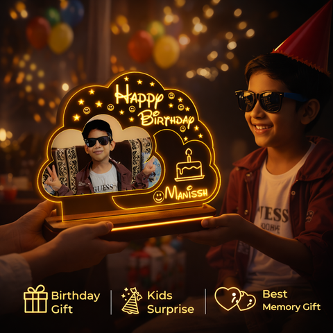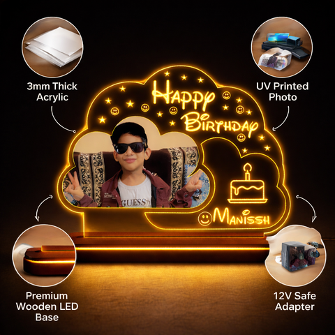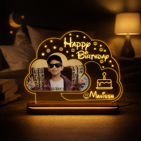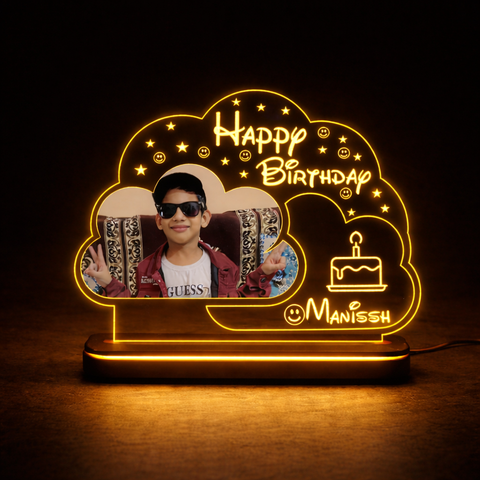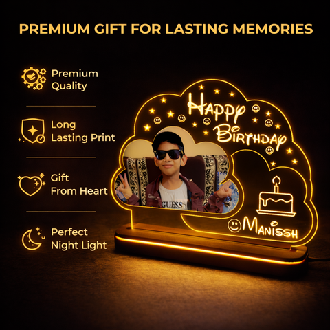 Personalized acrylic LED lamp with photo and name creates warm birthday glow perfect for room decor memorable gifting premium finish wooden base safe power