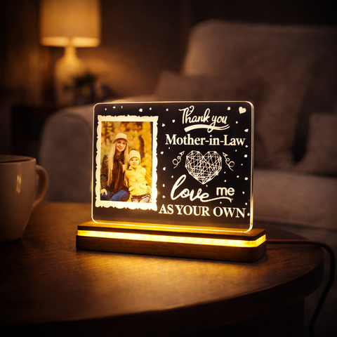 Personalized LED acrylic photo lamp designed with thank you mother in law message custom photo and loving quote. Warm light wooden base and glossy finish create an emotional decor gift