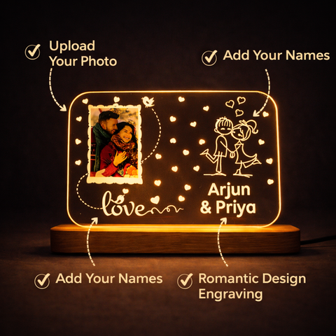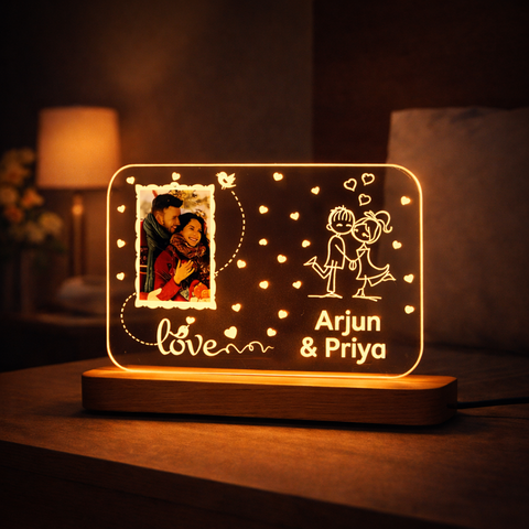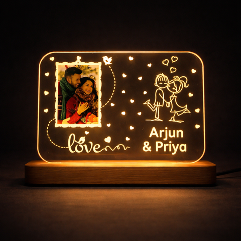 Personalized LED acrylic photo lamp with couple picture cartoon love art and custom names. Warm glowing light premium wooden base and glossy finish make it a perfect romantic decor gift