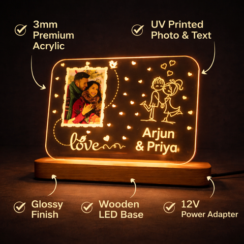 TERA MERA GIFT Customized Photo LED Acrylic Night Lamp Wooden Base Couple Name Cartoon Love Design Romantic Decor for Anniversary Birthday Valentine Gift