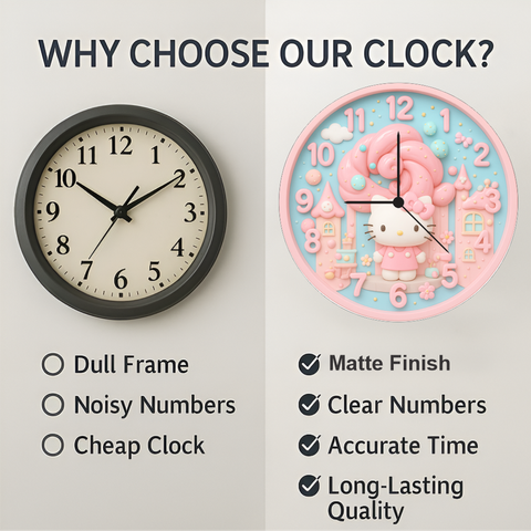 Bring charm to any room with this adorable cute kitty wall clock featuring a matte pastel design that lights up children’s spaces. The silent quartz movement ensures peaceful sleep while clear bold numbers help kids learn time easily. Perfect for bedrooms, study rooms, and home décor, it makes a thoughtful gift for birthdays and special occasions. A blend of beauty, function, and long lasting quality.