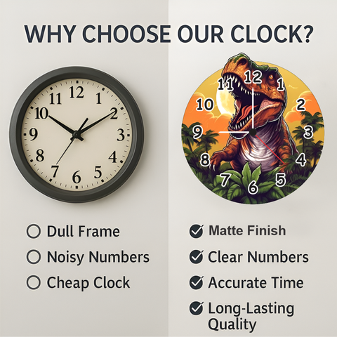 Add an adventurous touch to your childs decor with this dinosaur wall clock. Its vibrant colors, clear numbering, and quiet quartz movement make it ideal for birthdays, anniversaries, or return gifts that bring joy and excitement to kids rooms.