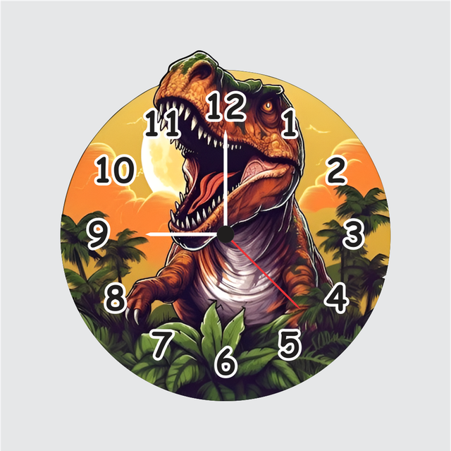 - Bright and bold dinosaur design clock ideal for decorating kids bedrooms and play areas with a wild twist.