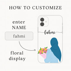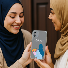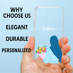 This elegant custom-name mobile cover features a serene blue-hijab girl artwork paired with soft TPU protection. Designed for girls who love aesthetic floral themes it keeps your phone safe from shocks while adding a personalized stylish touch. Perfect for gifting friends sisters and loved ones.