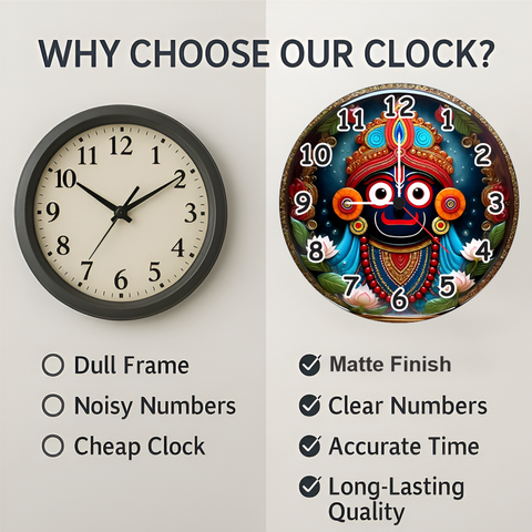 Enhance your home’s spiritual ambiance with our Jagannath Wall Clock. This devotional 12-inch design adds serenity and grace to your Decor while ensuring accurate time with a silent quartz mechanism.