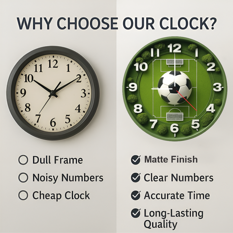 Bring the thrill of the stadium into any kid’s room with this vibrant football-themed wall clock. Its bold field design and realistic ball centerpiece create a fun and energetic atmosphere. Durable, accurate, and eye-catching—perfect for gifting or decorating any young sports fan’s space.