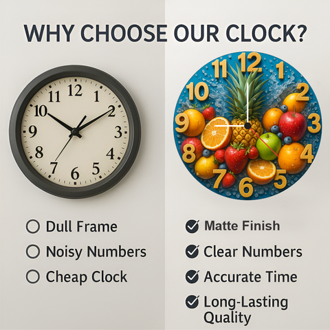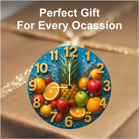 Add a splash of freshness to your home with this vibrant fruit-themed wall clock designed to energize kitchens, dining rooms, and cafés. The silent quartz movement provides peaceful accuracy while the large golden numbers offer easy readability. Perfect as a housewarming gift or décor upgrade, its colorful artwork brings life to any room with long-lasting quality and modern style.