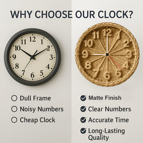 Enhance your space with the natural warmth of our Handcrafted Jute Rope Wall Clock. Designed using detailed rope work throughout the dial and numbers, this clock brings a rustic, earthy charm to any interior. The sturdy 6mm matte board ensures durability while the quiet, accurate quartz mechanism keeps time consistently. Ideal for living rooms, offices, cafés and farmhouse-style décor, it also makes a thoughtful gift for housewarming, festivals or décor lovers.