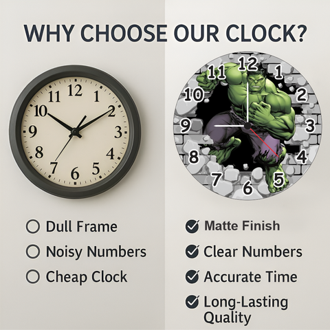 Hulk Kids Wall Clock is made from 6mm MDF with a premium matte finish, featuring a dynamic cartoon hero design. It’s an ideal addition to any child’s room or play area decor.