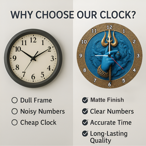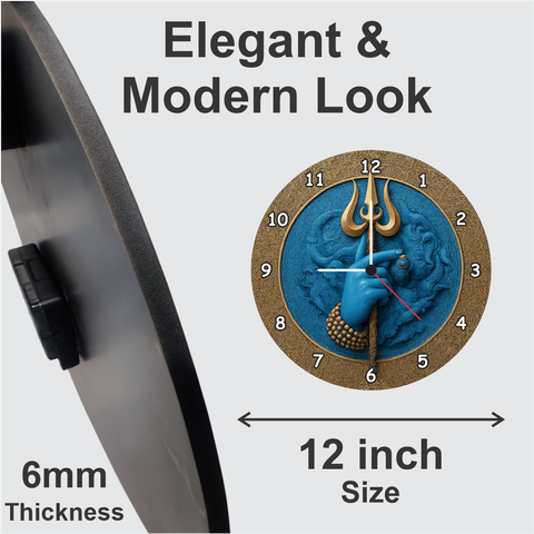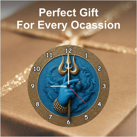Bring divine energy into your home with this Mahadev Trishul wall clock crafted to add spiritual elegance to any space. The deep blue Shiva artwork and powerful Trishul design create a sacred ambience ideal for living rooms, puja rooms, and meditation areas. Featuring silent quartz movement and clear numerals, it blends devotional beauty with functionality—perfect for gifting on festive and spiritual occasions.