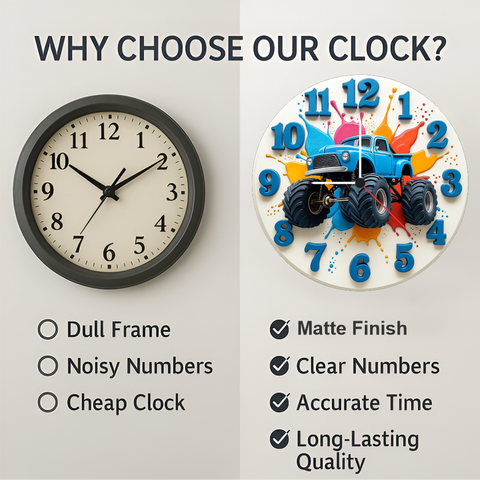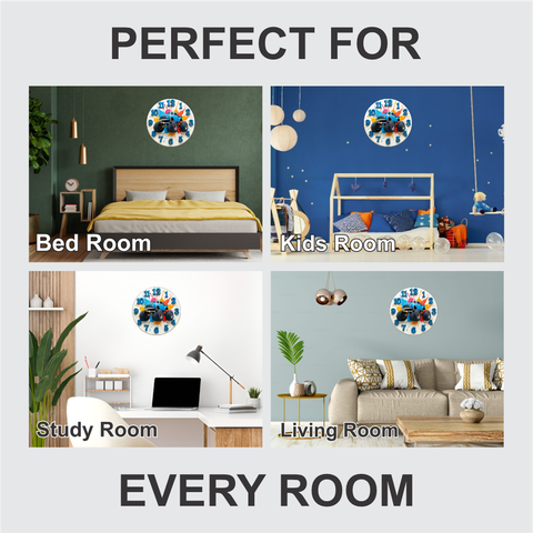 This vibrant monster truck wall clock brings power and colour to any room. Its bold numbers help kids learn time easily while the 12‑inch size enhances décor in bedrooms living rooms and study corners. The durable 6mm board and accurate quartz movement ensure long-lasting performance—ideal for birthdays, home décor and gifting.