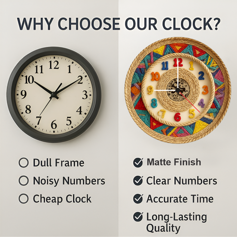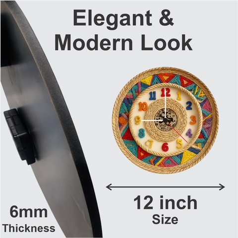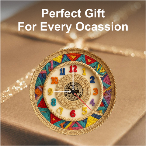 Add a vibrant artistic touch to your home with the Multicolor Handcrafted Rope Wall Clock. Designed with bold colours, woven rope detailing and 3D multicolour numbers, this décor piece instantly brightens any room. The strong 6mm matte board keeps it sturdy, while the accurate quartz movement ensures perfect timekeeping daily. Ideal for living rooms, kids’ rooms, study spaces and festive décor themes, it also makes an excellent housewarming or celebration gift.