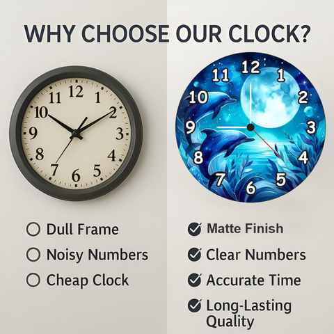 Add a touch of oceanic serenity to your home with this Ocean Dolphin Theme Wall Clock. Crafted from high-quality 6mm MDF with a 12-inch size, this clock features a vibrant blue underwater design with dolphins and a moonlight backdrop. Equipped with a precision quartz mechanism, it ensures accurate time and silent operation. Perfect for bedrooms, kids’ rooms, or as a thoughtful gift for ocean lovers.