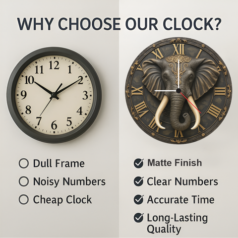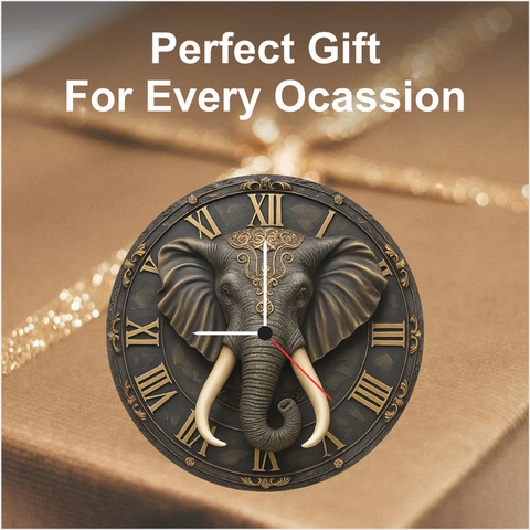 This royal elephant wall clock blends vintage charm with modern craftsmanship. Its antique Roman numerals, carved-style detailing, and elegant matte finish make it a standout décor piece. The accurate quartz machine ensures perfect time, making it a powerful gift for wildlife lovers and décor enthusiasts.