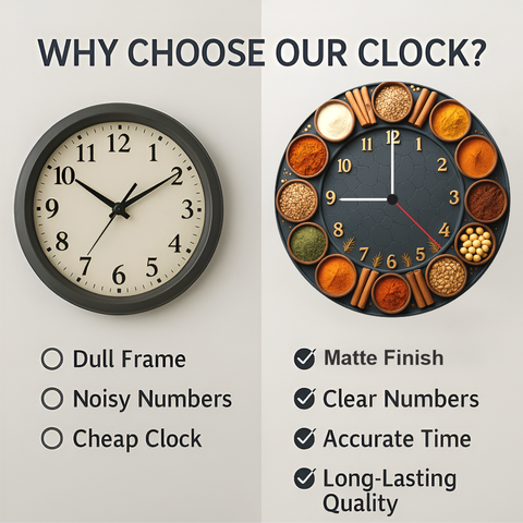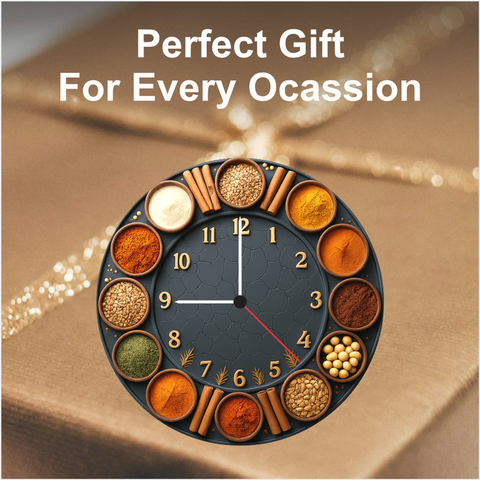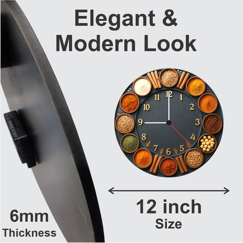 Enhance your kitchen décor with our Spice Wall Clock, designed for those who love cooking and vibrant aesthetics. The 6mm matte finish ensures long‑lasting durability, while the premium spice‑themed artwork brings a warm, rustic charm to any kitchen, dining area, café, or restaurant. The clear golden numbers offer excellent visibility from across the room. Powered by a reliable quartz movement, it delivers accurate time for everyday cooking routines. A wonderful choice for festive gifting, birthdays, and home décor upgrades.