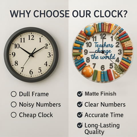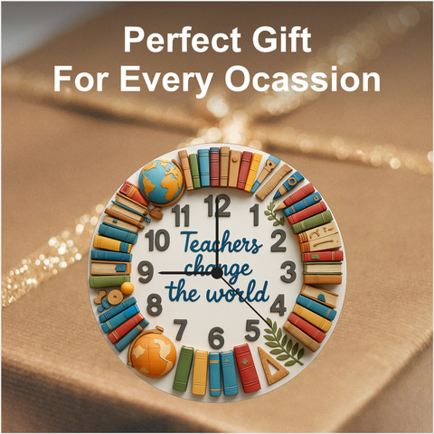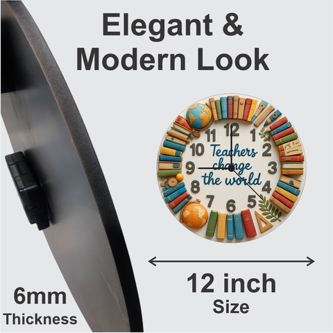 This teacher quote wall clock brings warmth, gratitude and education-inspired charm to any space. With colourful books, globes and raised numbers, it enhances classrooms and offices. The 6mm durable matte board and precise quartz ensure lasting accuracy—perfect for gifting teachers and decorating study rooms.