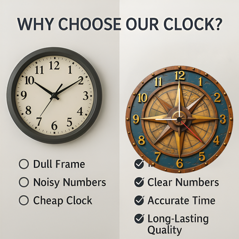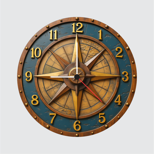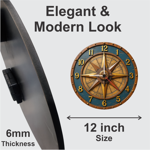 Bring timeless beauty into your space with this antique compass-themed wall clock. Its rich golden detailing and raised numbers add sophistication to any room. The strong 6mm board and accurate quartz mechanism ensure durability and precision—perfect for home décor offices study rooms and premium gifting.