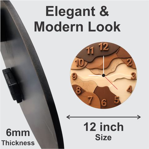 Bring warmth and artistic charm to your space with our Wooden Layer Art Wall Clock, crafted to enhance any modern or rustic décor theme. Its layered brown texture design adds depth and sophistication, while the premium 6mm matte board ensures durability. The clock features soothing earthy tones that blend beautifully with living rooms, offices, study areas and bedroom interiors. Powered by a reliable quartz movement, it ensures accurate timekeeping all day. A perfect décor upgrade and a wonderful housewarming or festive gift.